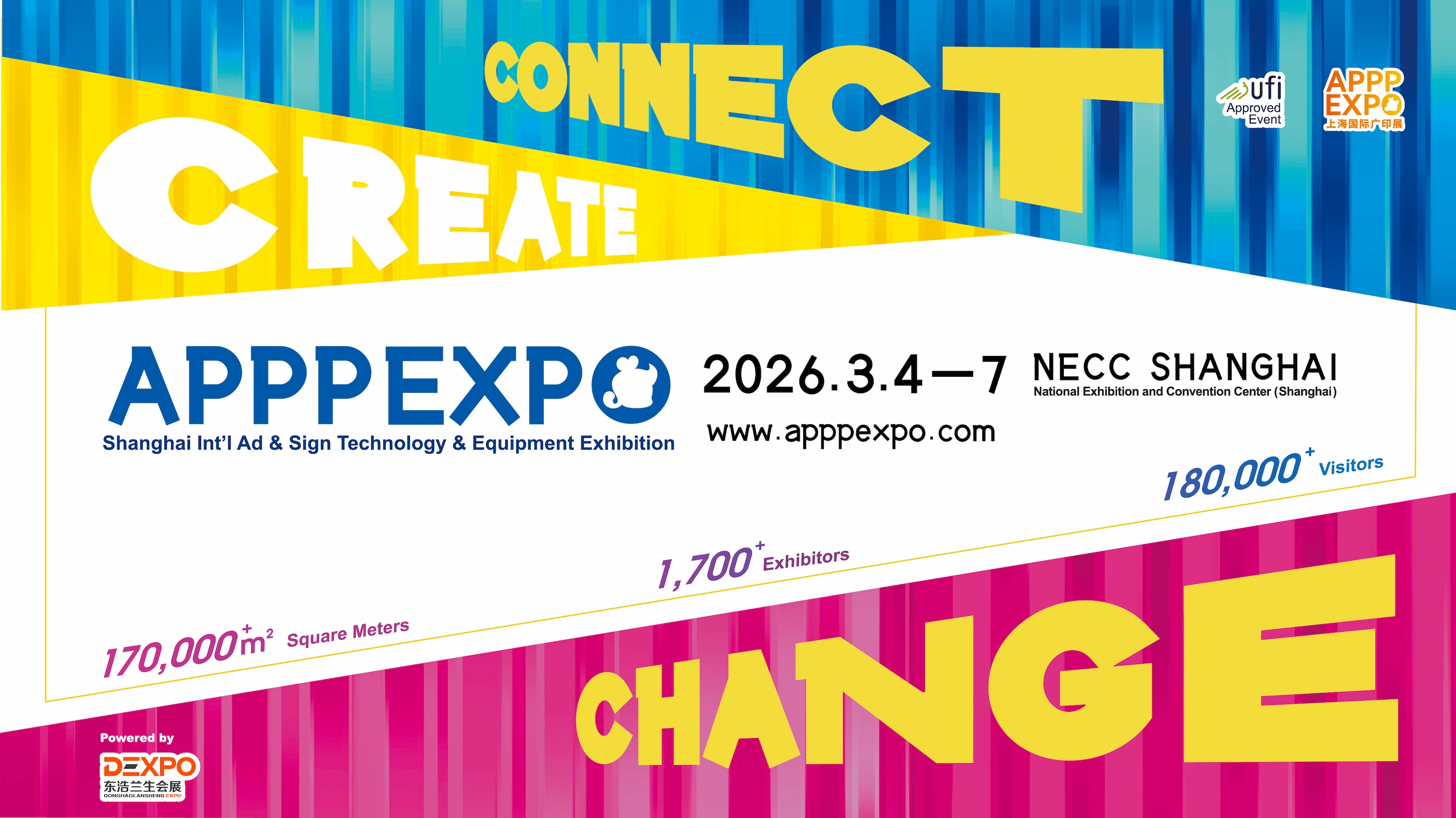 The 2026 APPPEXPO will shine once again at the National Exhibition and Convention Center (Shanghai) from March 4-7, 2026.Under the theme "Connect · Create · Change" the expo will seize opportunities in integrating creative economy, digital economy, and green economy into industrial development. It will showcase cutting-edge innovations across advertising displays, textile printing, signage, packaging and printing, commercial printing, personalized customization, and biomedical fields. With a renewed approach, APPPEXPO aims to lead new trends in the printing and advertising industry and drive industrial upgrading.