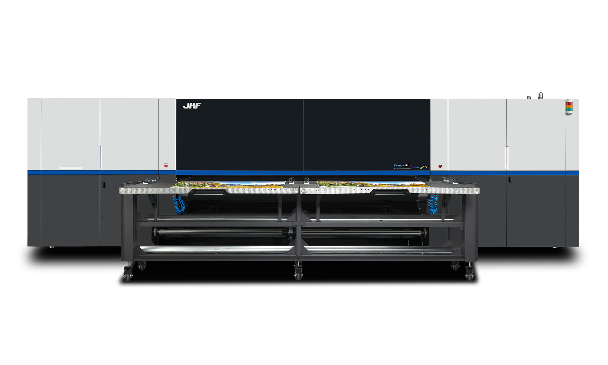Venus 33x is a high-end flatbed-roll-to-roll integrated machine independently developed by JHF, with UV printing functions for both sheets and rolls. With a 3.2-meter wide print width, it can print different-sized materials within two rolls of 1.6 meters simultaneously, significantly improving production efficiency. Venus 33x is equipped with material automatic edge-finding function, accurately detecting the edges of single or multiple materials for intelligent layout, making the printing process more efficient. It can be equipped with an intelligent sheet loading and unloading system, capable of printing 4 sheets simultaneously, achieving multiple uses with one machine, saving industrial costs. The ink curing system uses industrial-grade UV curing lamps to enhance curing efficiency. Venus 33x, the high-end flatbed-roll-to-roll integrated machine, will empower industries with a more efficient production model, helping customers unleash their production efficiency potential, bringing more commercial value.